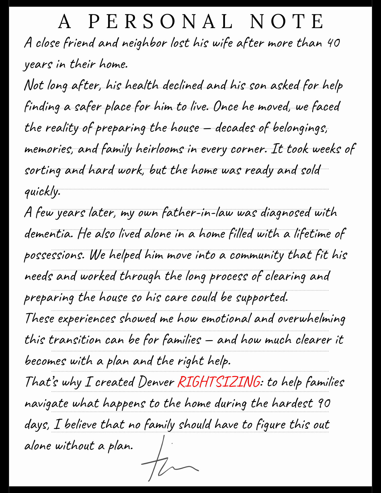 Denver RIGHTSIZING was created to help to help families navigate one of the most overwhelming transitions they’ll face: helping a parent move while trying to decide what to do with their home. I work with many Denver families in this exact moment - sorting through decades of belongings, balancing emotions, and making decisions quickly. After going through similar experiences with friends and family recently, I realized how much clearer and calmer this process can be with the right plan and guidance. This site exists to give you that clarity and help you take the next step with confidence